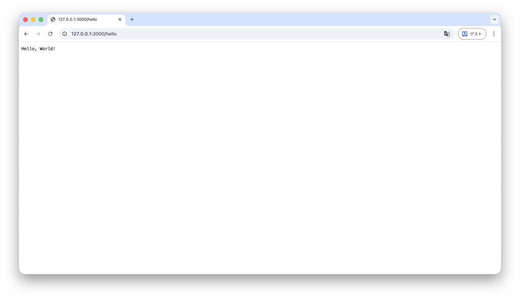 Hello, World! と表示されれば成功です。ブラウザから http://127.0.0.1:3000/hello にアクセスしても、同じ結果が得られます。